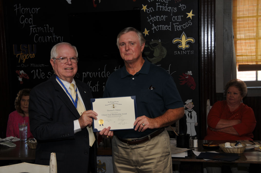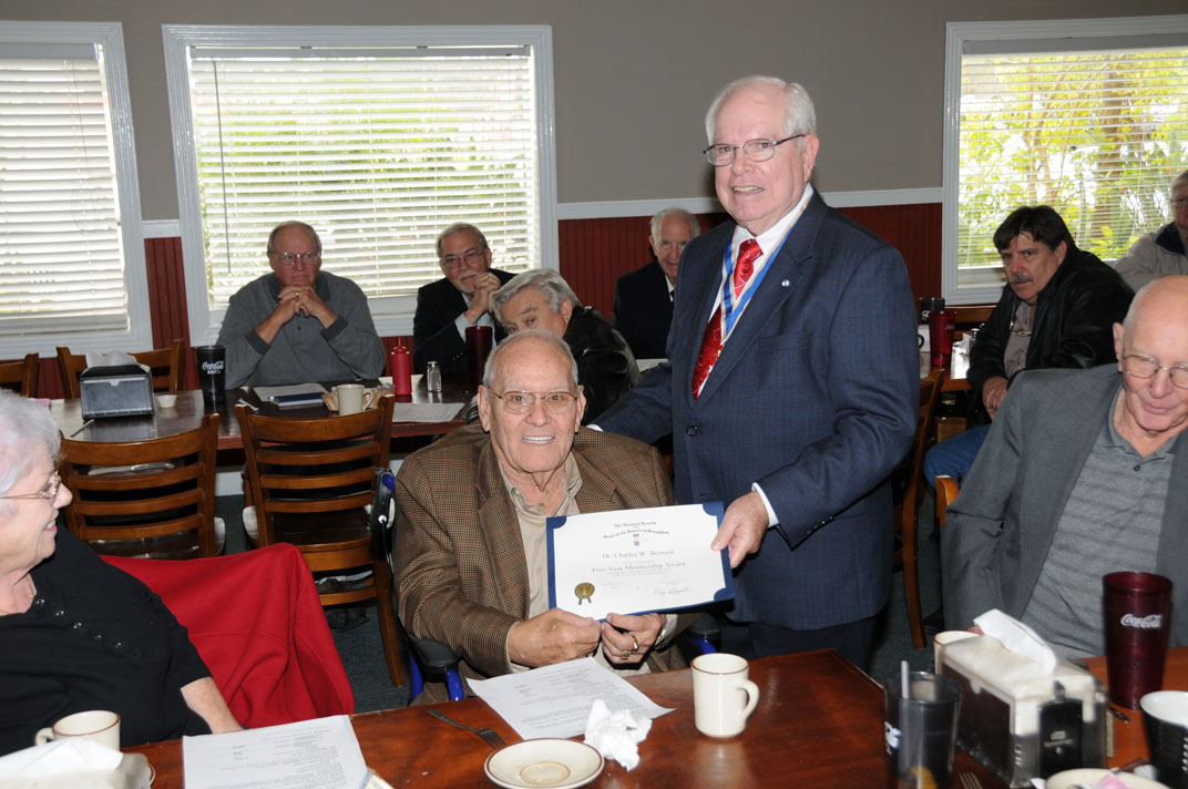 Compatriot Dr. Chuck Bernard receives his 5-Year Membership Certificate from President Win Avera 10 Dec 2016.