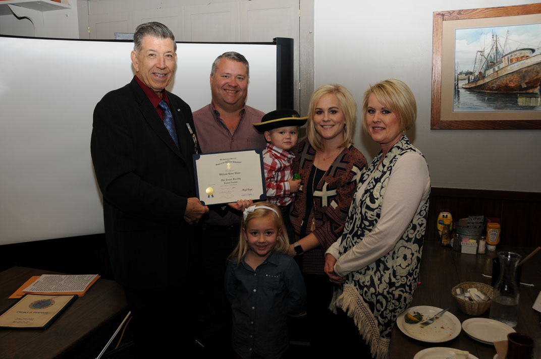 Two-year-old William Glaze of Victoria, TX, shown with family, is inducted as Junior SAR member by Registrar Bill Sanders 12 Nov 2016