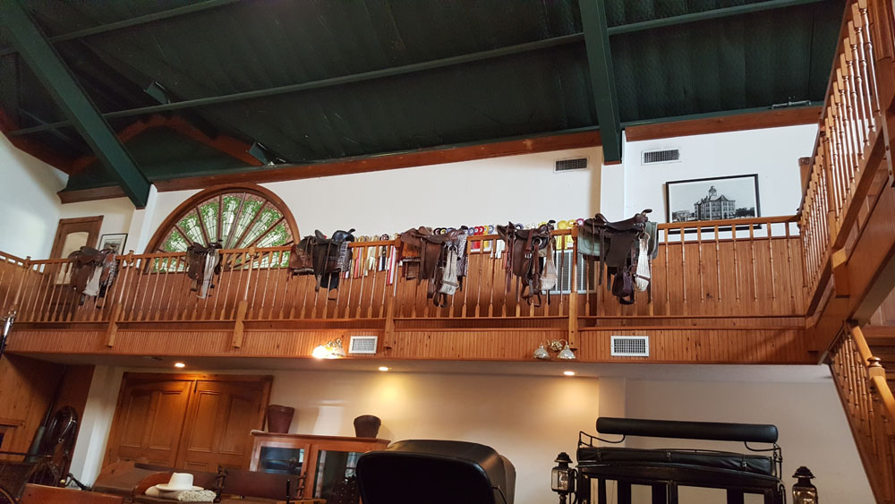View 4 inside the Morris Ranch Carriage House in Burr, TX 8 Oct 2016. The small saddle, second from left was used by Stewart Morris Jr. when he was age 7.