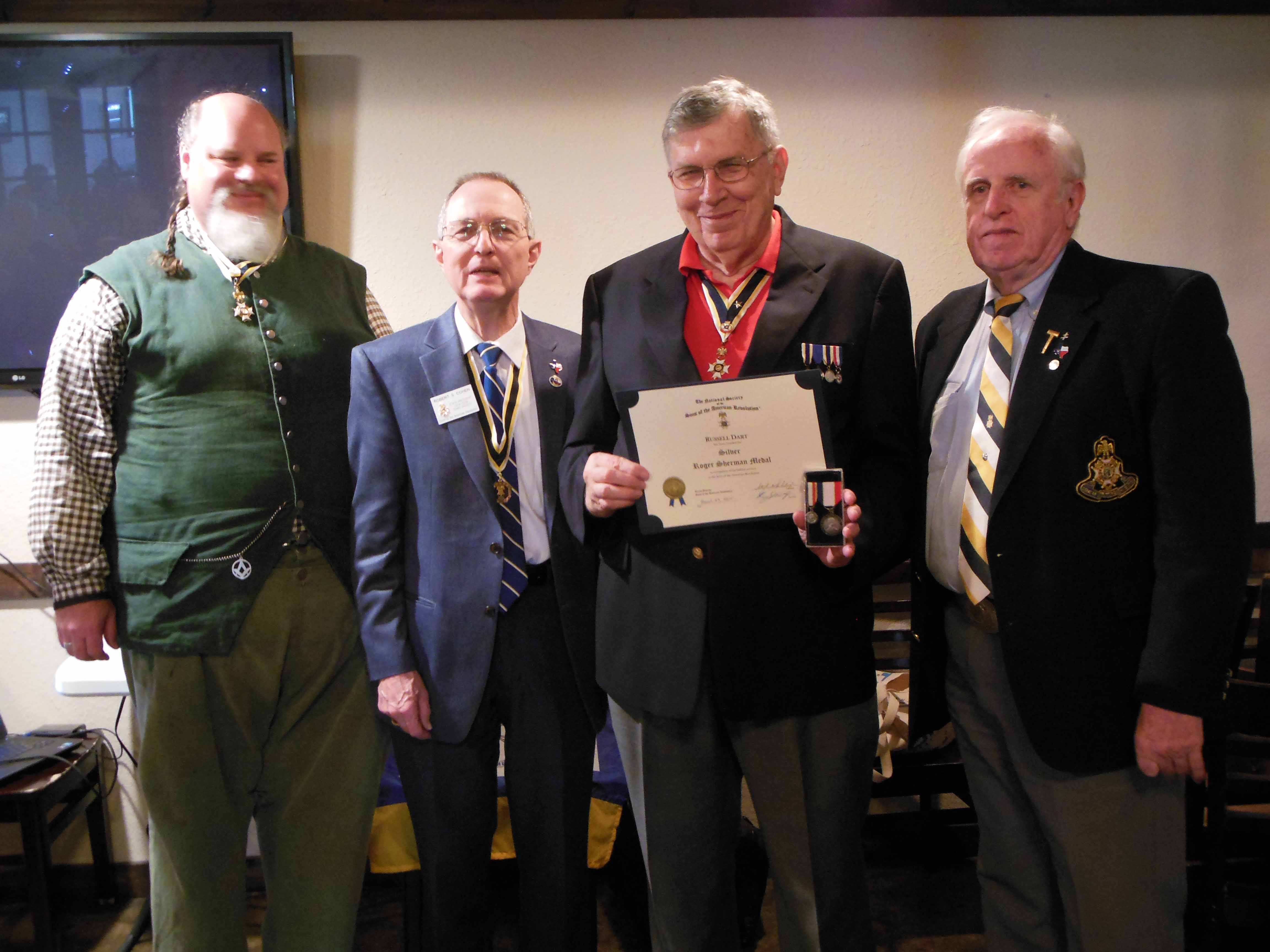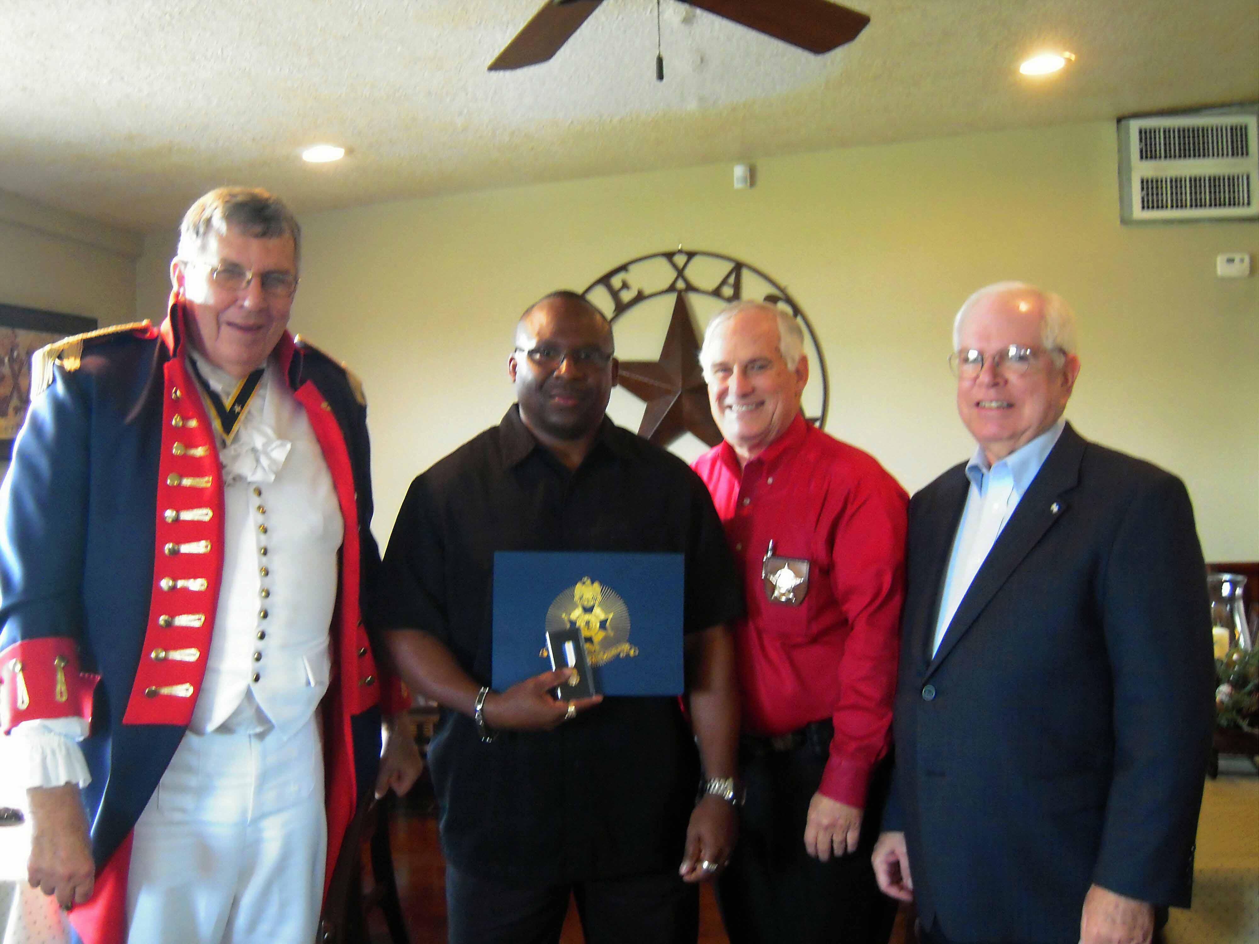 Judy and Dr. Chuck Bernard receive the Certificate of Appreciation for their contribution to the Center for Advancement of American Heritage from TXSSAR Treasurer Russell Dart 10 Dec 2016.