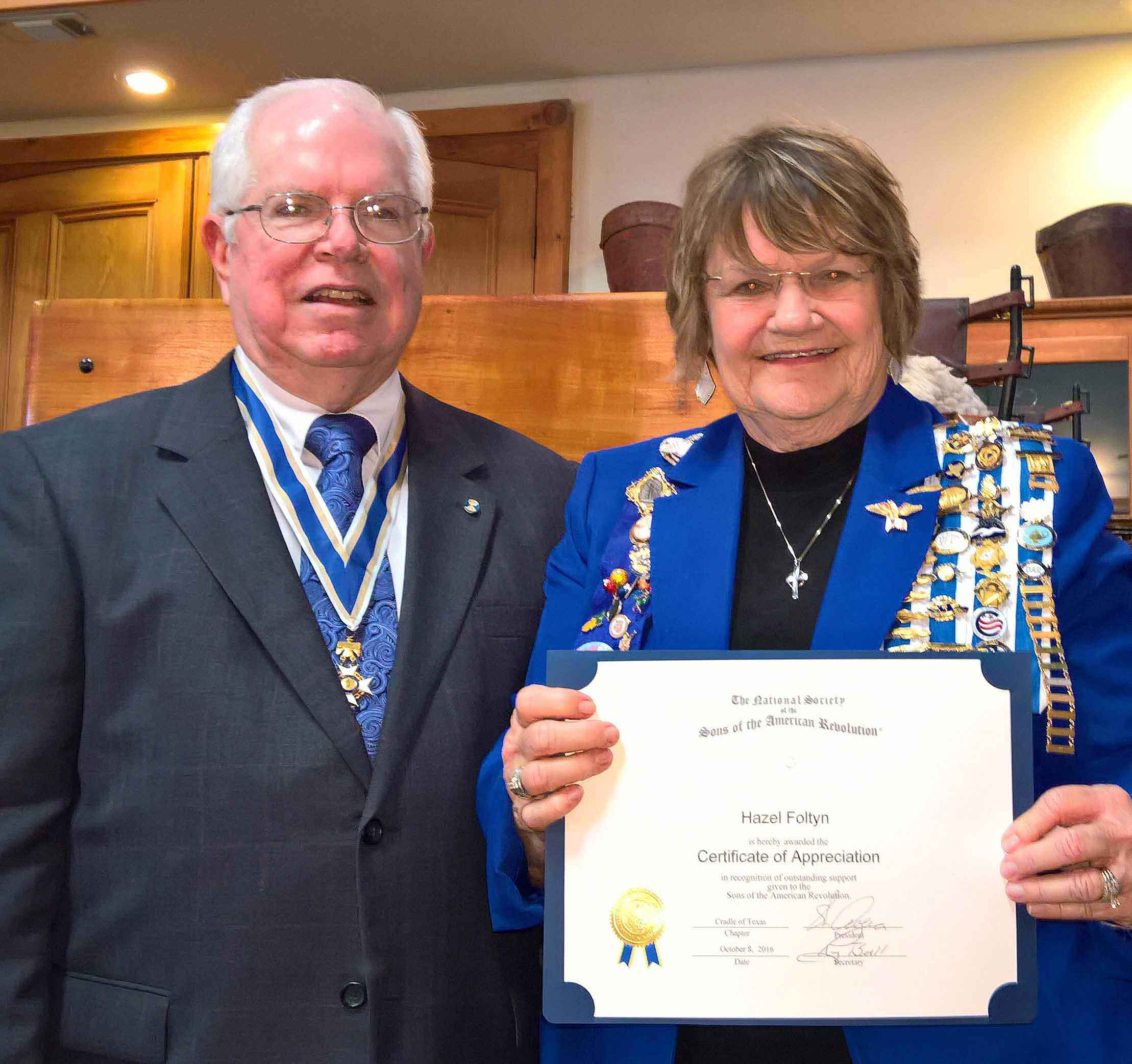 Hazel Foltyn, Regent for Comfort Wood DAR receives Certificate of Appreciation in recognition of outstanding support given to the SAR
