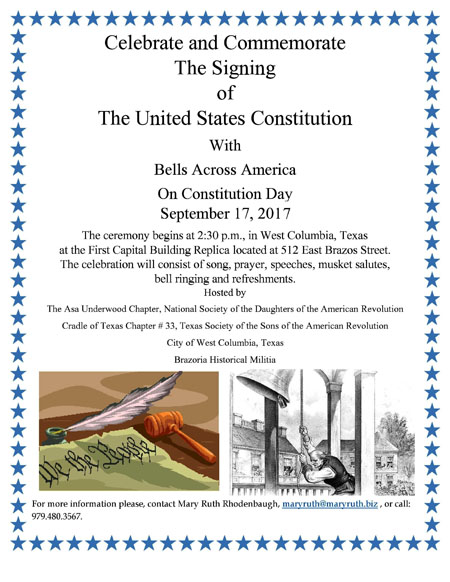 Cradle of Texas Chapter #33 TXSSAR Past Presidents Michael Bailey and Arnold Seidule attend the Constitution Day Signing / Bells Across America Celebration at the Columbia Historical Museum, West Columbia, TX 17 Sep 2018