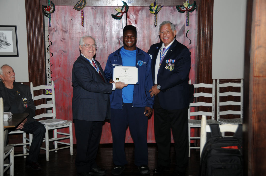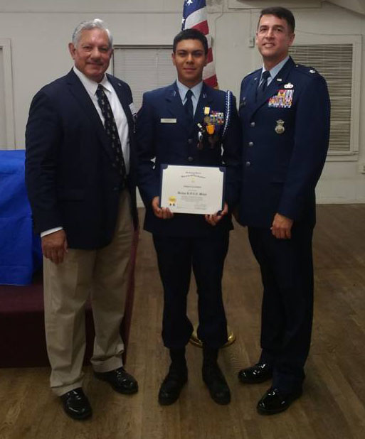 SAR vice president Ray Beall (left) presented Wharton I.S.D. junior Jordan Ramirez the bronze medal and certificate for ROTC (center) Byrl R. Engel, Lt. Colonel., USAF (right) on May 25, 2017. Jordan also received $750.00 scholarship for winning second place in the state essay contest.
