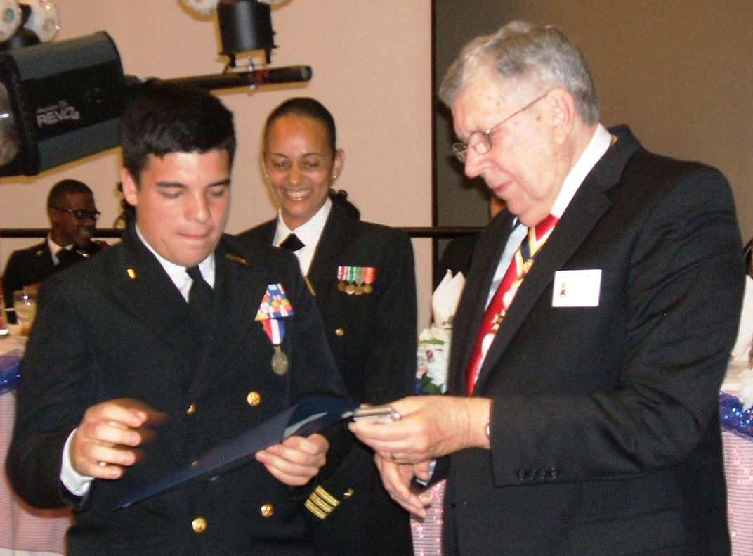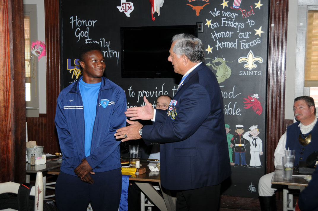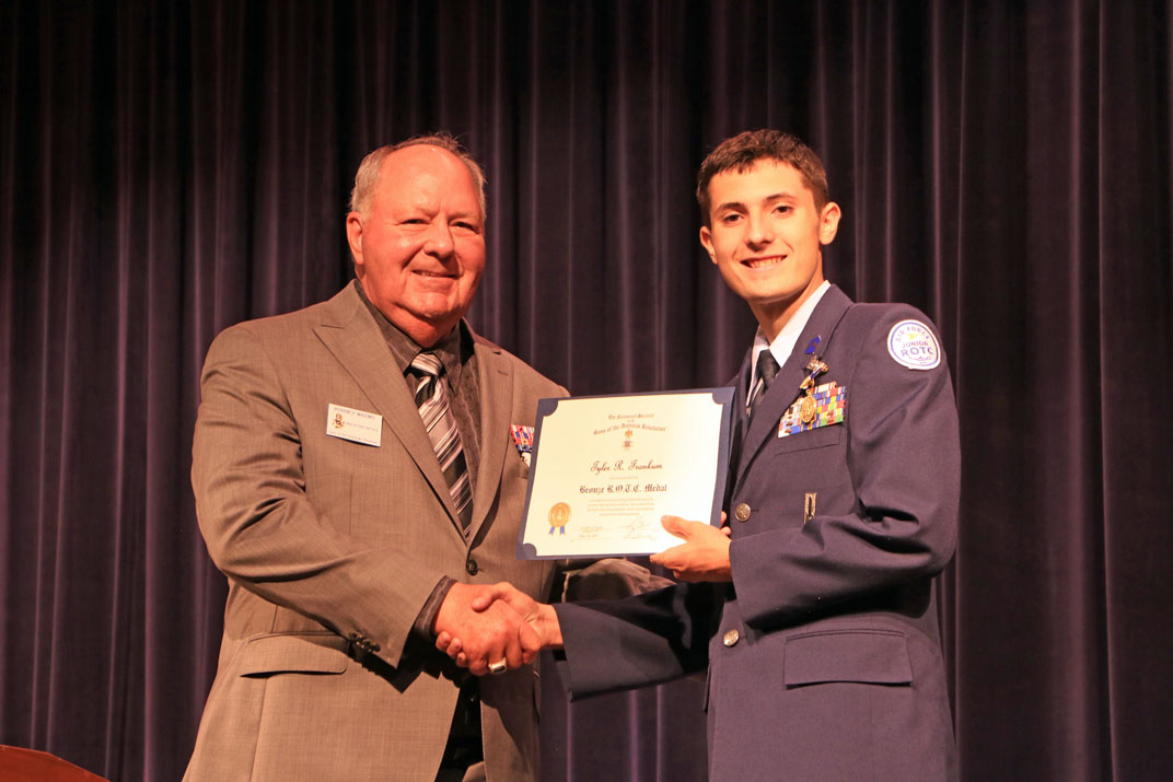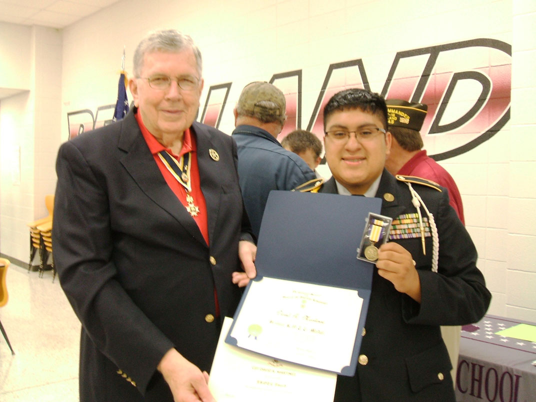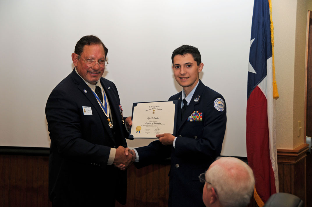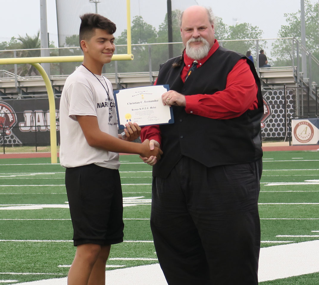 Cradle of Texas Chapter 33 SAR’s Michael Bailey presents the JROTC Bronze Medal To Alvin High School Recipient Marine Corps Cadet Christian C. Fernandez.