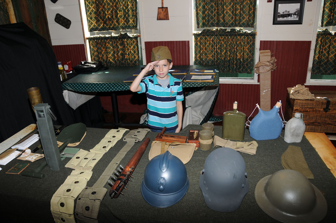 Caleb Smith, one of our youngest compatriots, at attention over WWI artifacts
