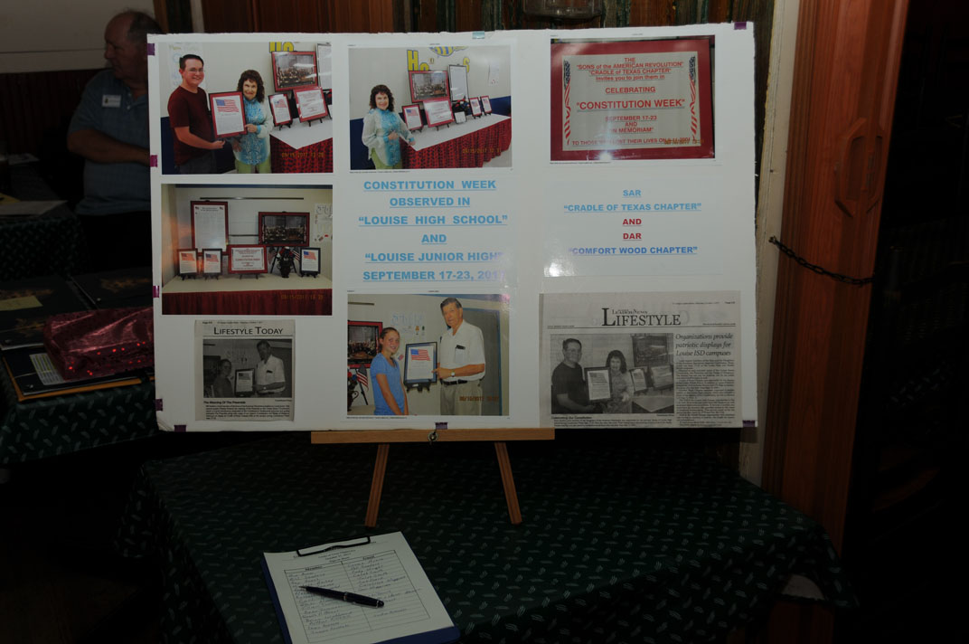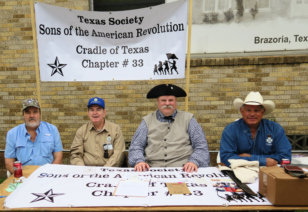 This photo gallery illustrates some of the Cradle of Texas Chapter #33 Sons of the American Revolution’s historical participation in patriotic, community, civic, educational events and ceremonies. Click on an image to open a larger version in a viewer. Use the right and left arrows in the viewer to scroll through the gallery. When finished, click the small “X” in the upper right corner to exit the viewer and return to the gallery. Our chapter meets January through May and September through December usually on the second Saturday of the month.