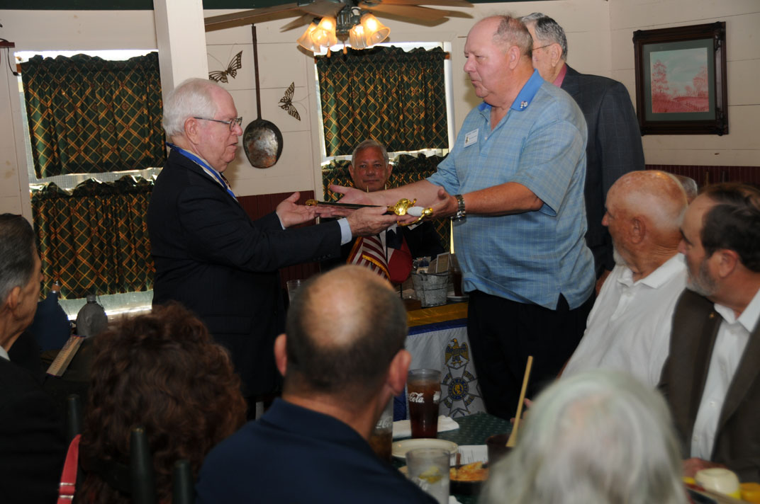 Rodney Weems presents the sword he won at the TX SAR Board of Managers meeting to Chapter President Win Avera