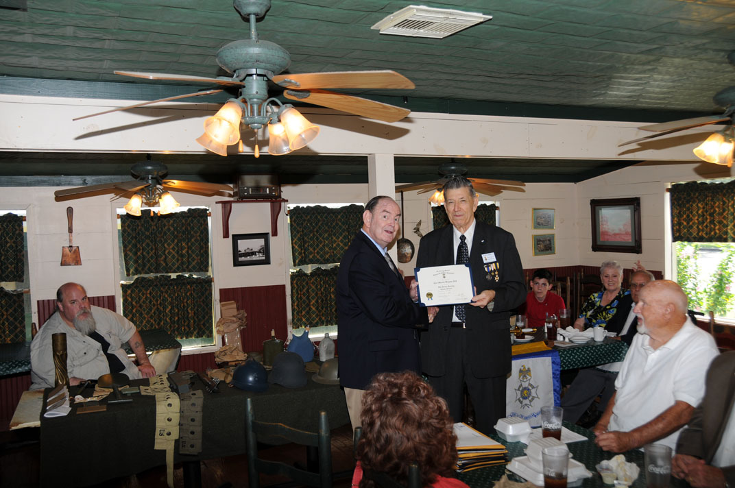 Rodney Weems (left) receives the Certificate of Appreaciation from President Win Avera for outstanding service as Chapter Secretary Education Outreach Chairman in furthering the mission of the SAR