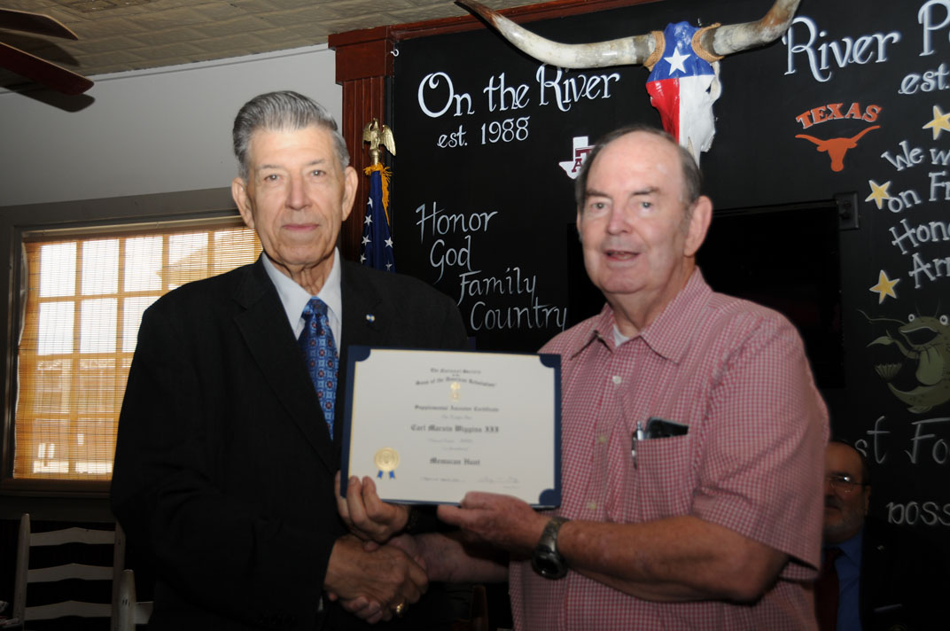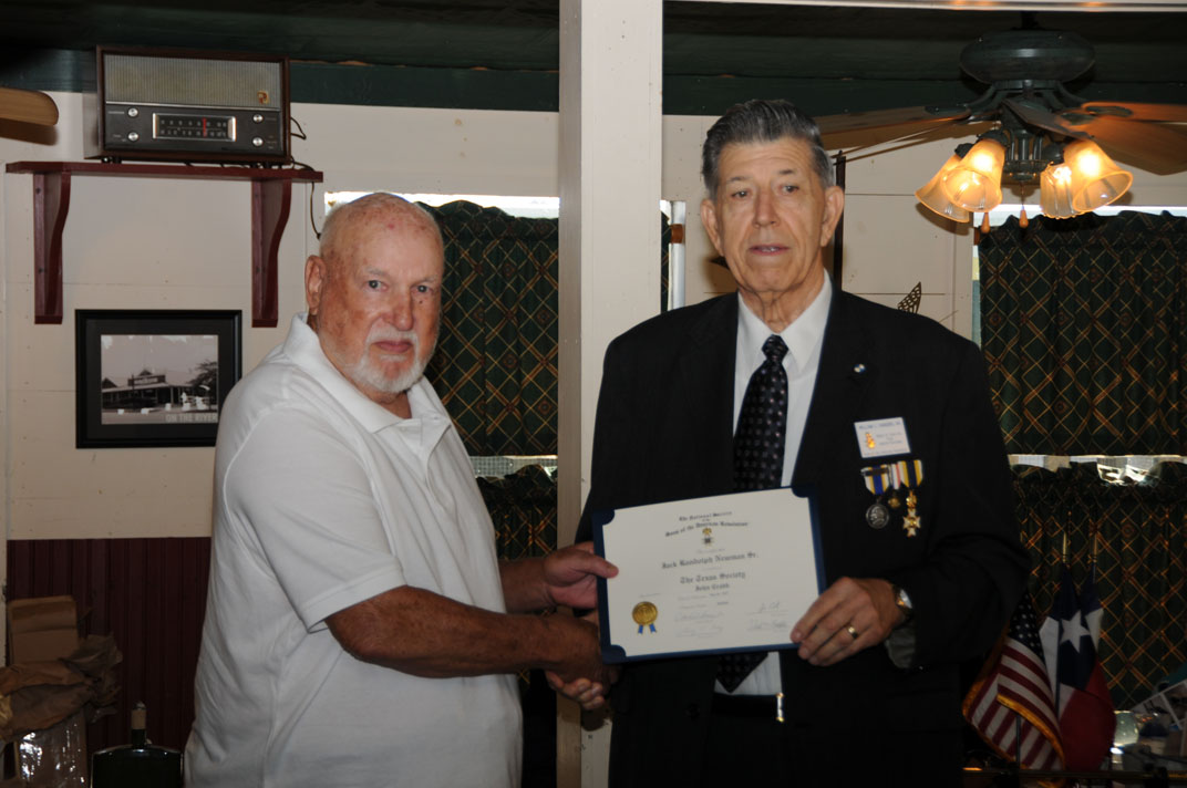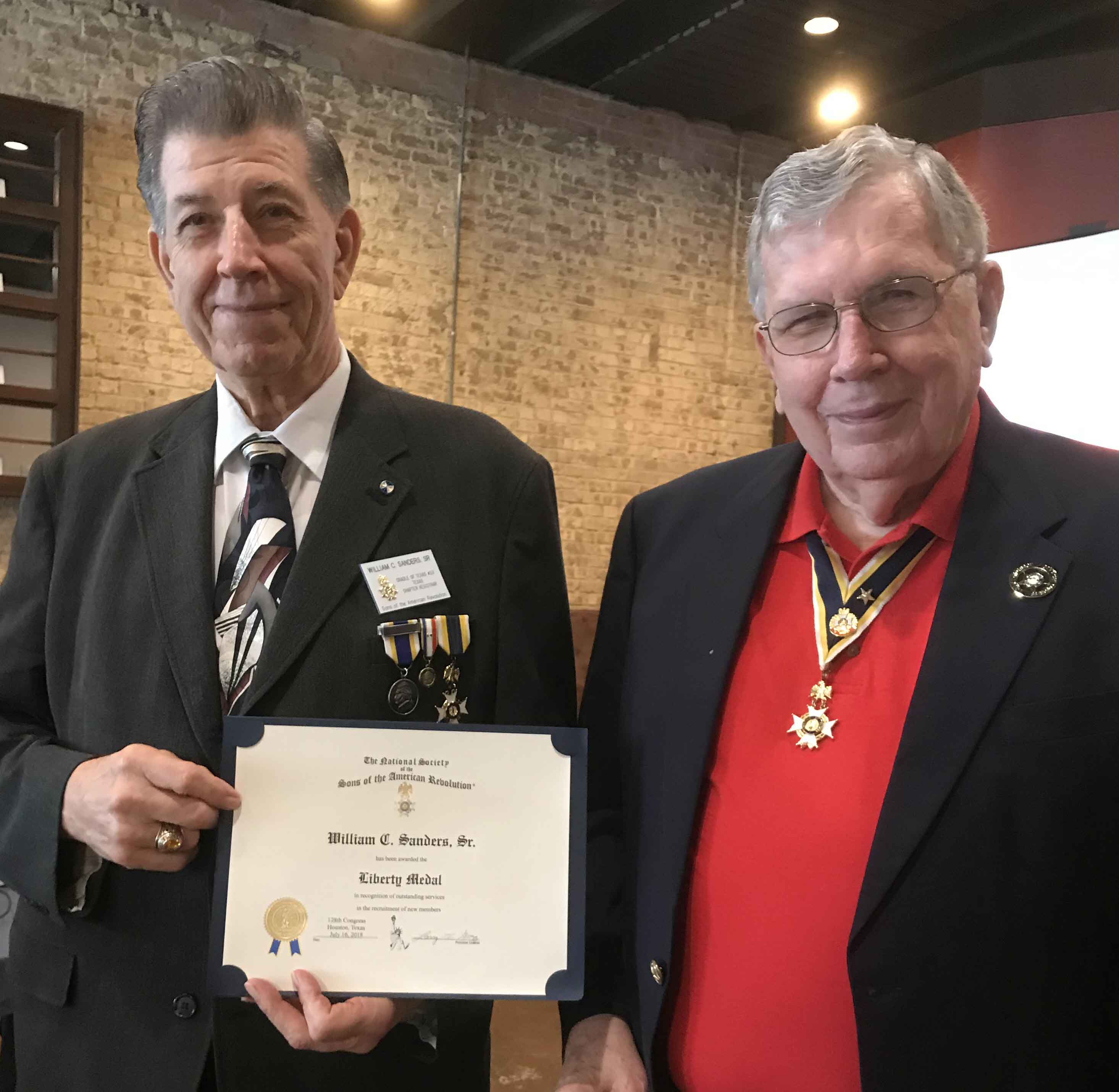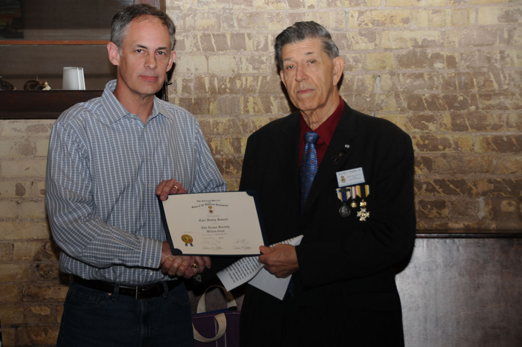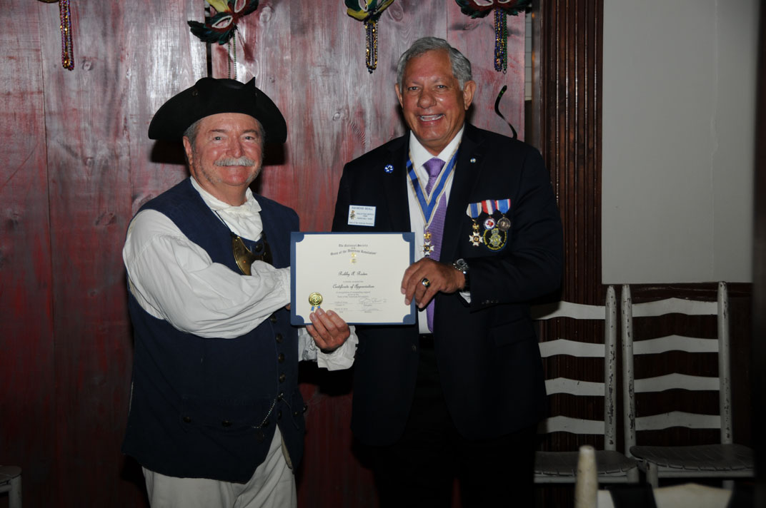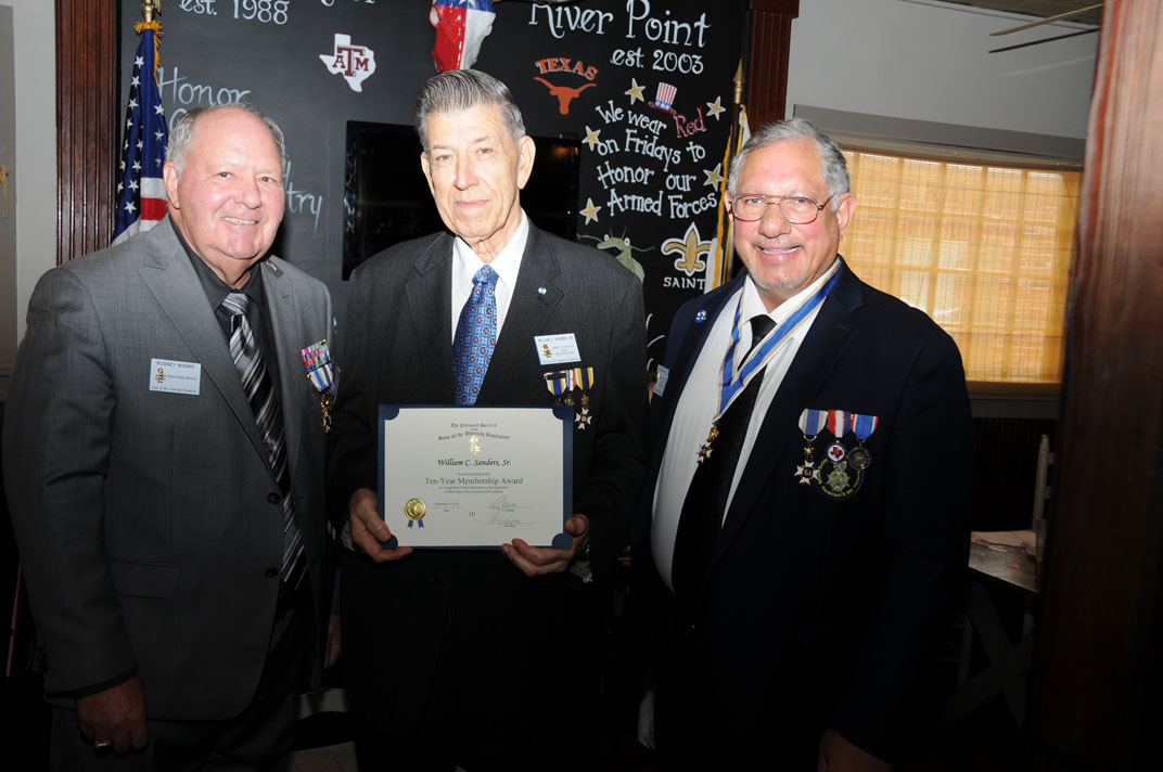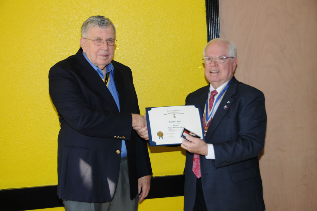 Registrar Bill Sanders receives his third Liberty Medal for having inducted his 30th new member from Russell Dart, TX Society Treasurer of the Sons of the American Revolution.