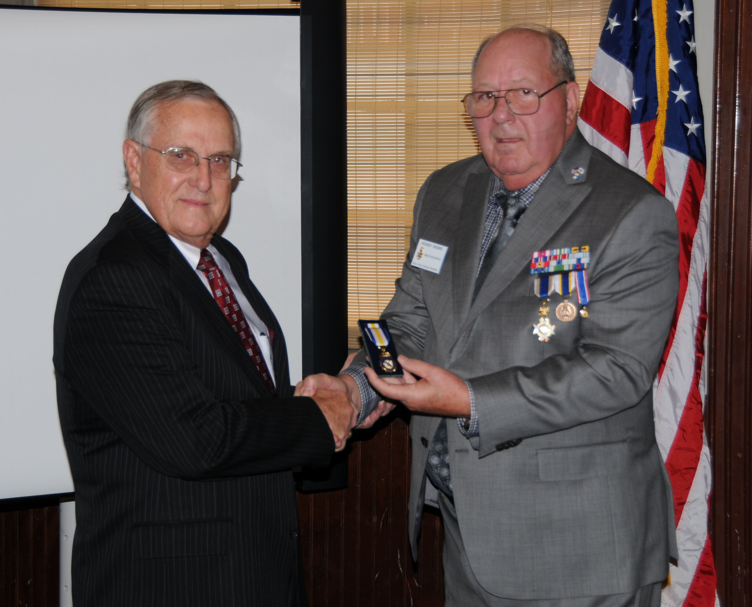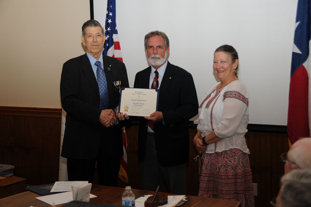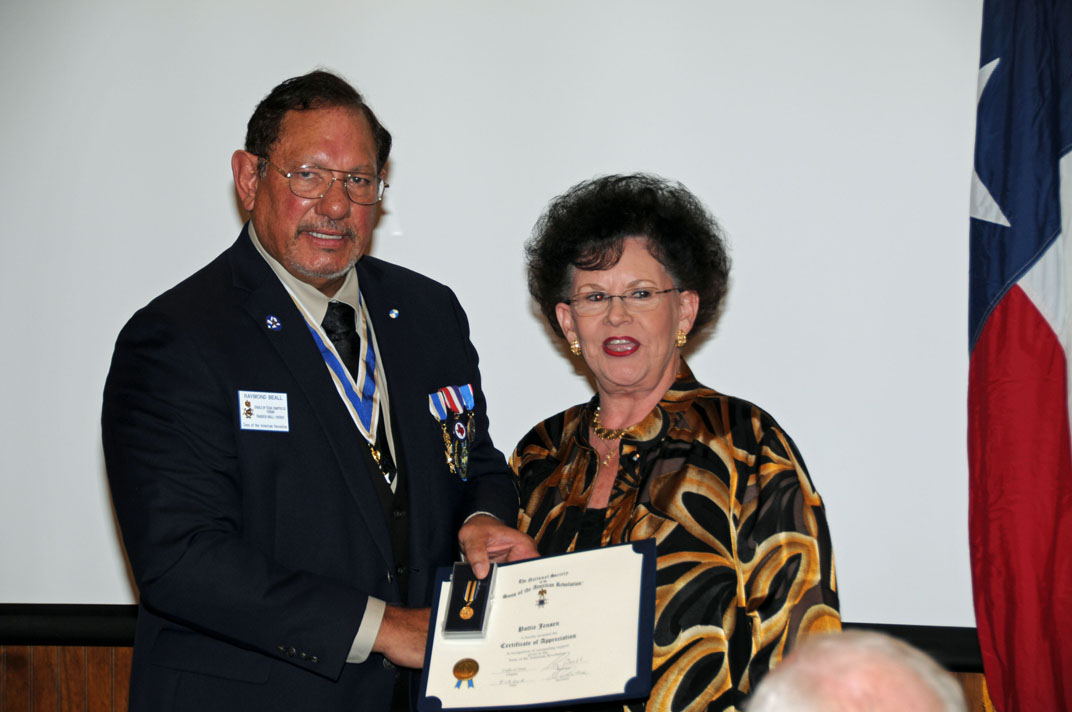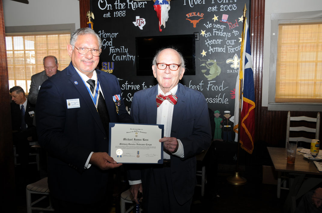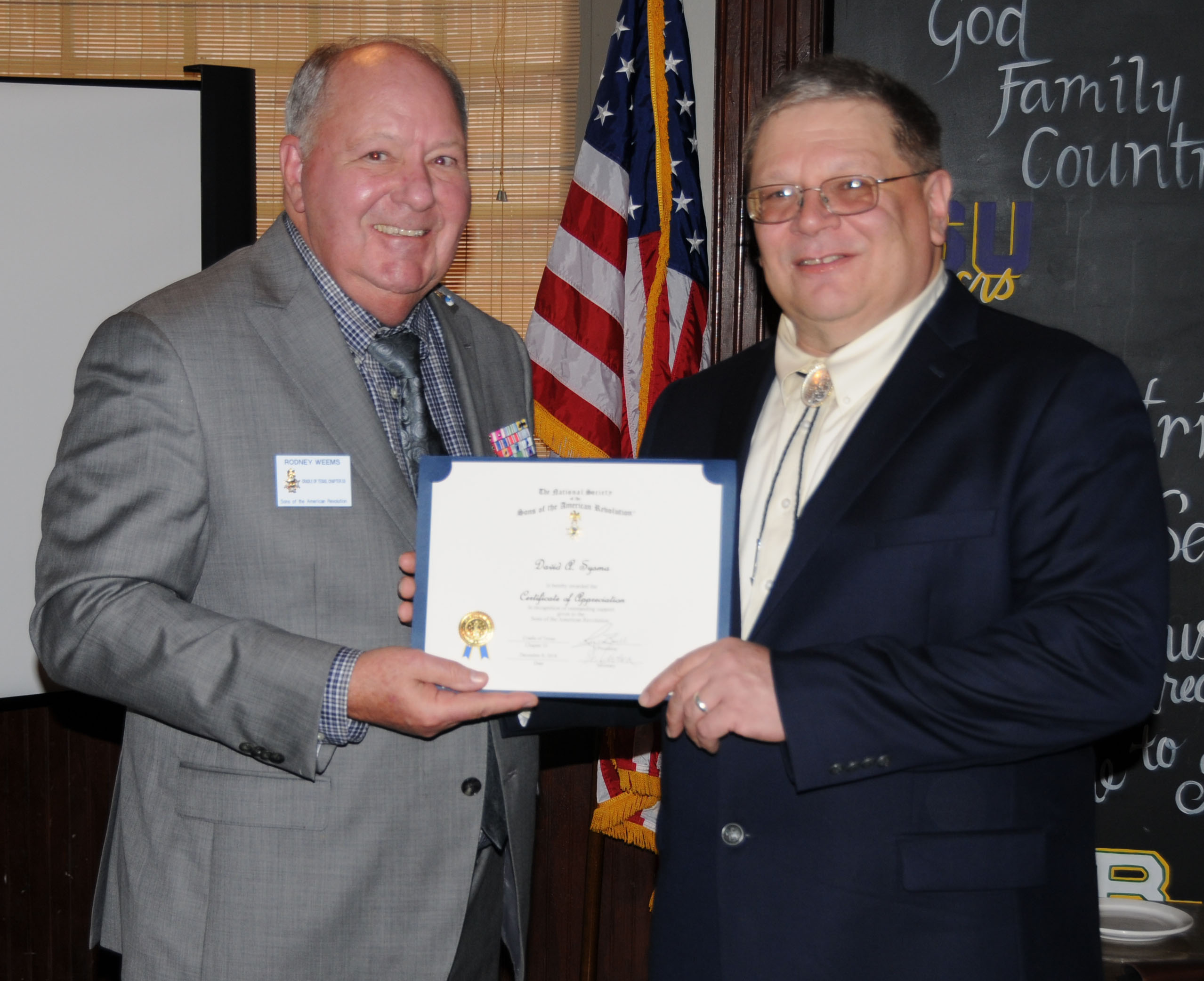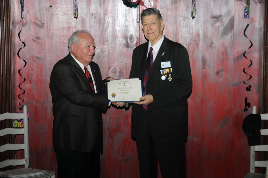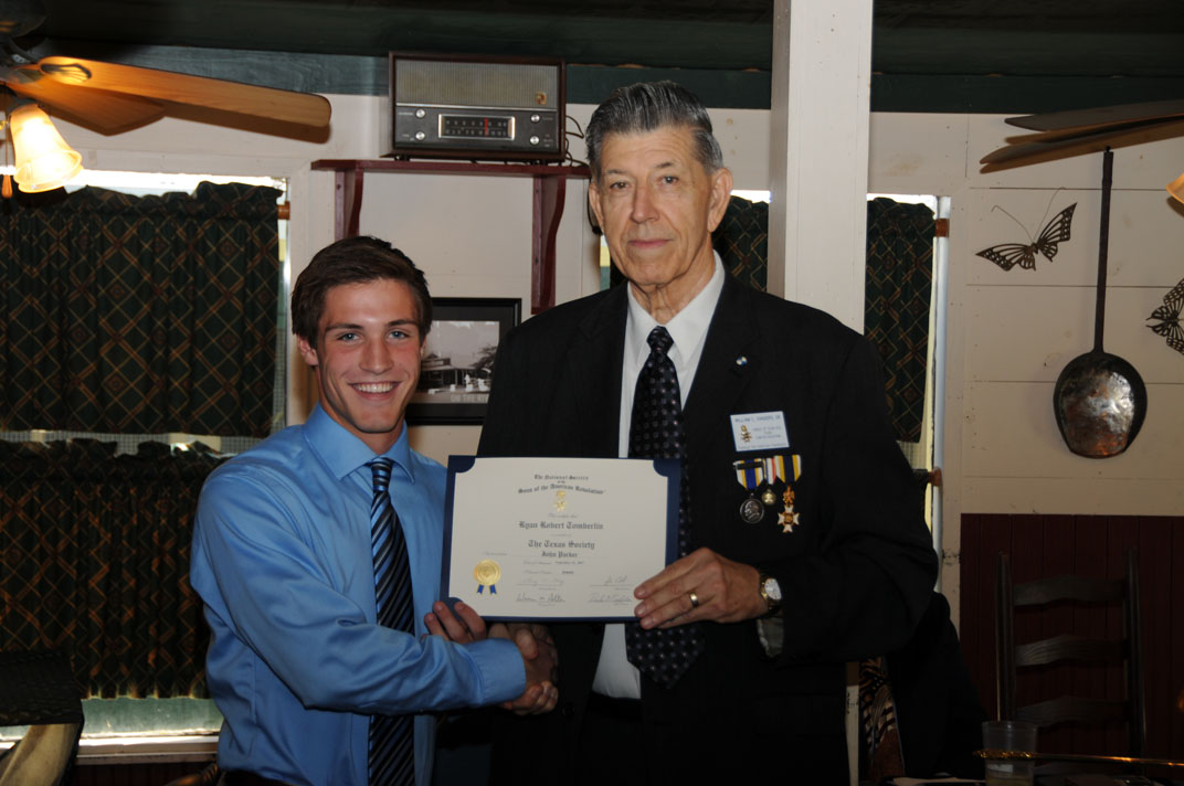 Registrar Bill Sanders receives his third Liberty Medal for having inducted his 30th new member from Russell Dart, TX Society Treasurer of the Sons of the American Revolution.