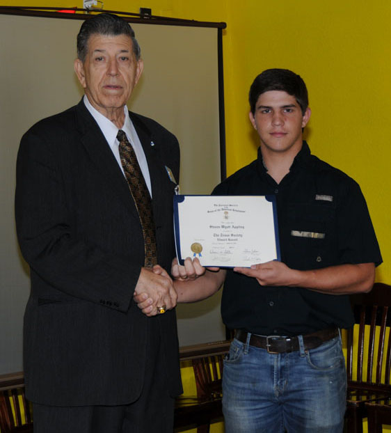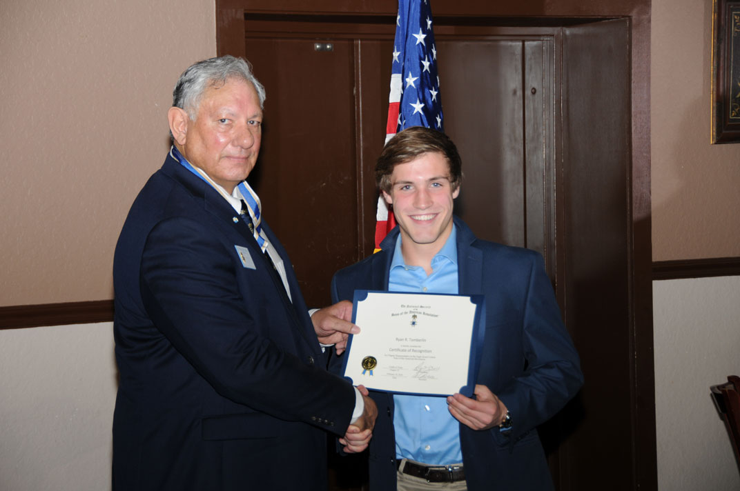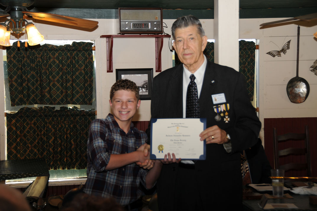 Ryan R Tomberlin receives a Certificate of Recognition from President Ray Beall for representing our Chapter in the SAR Eagle Scout Contest.