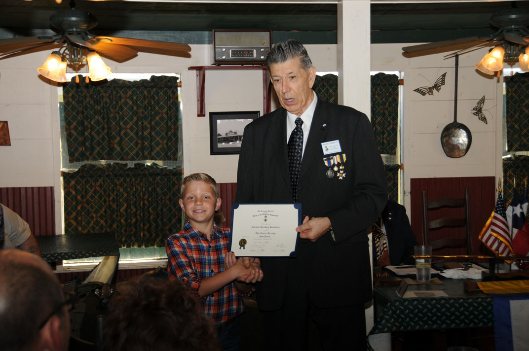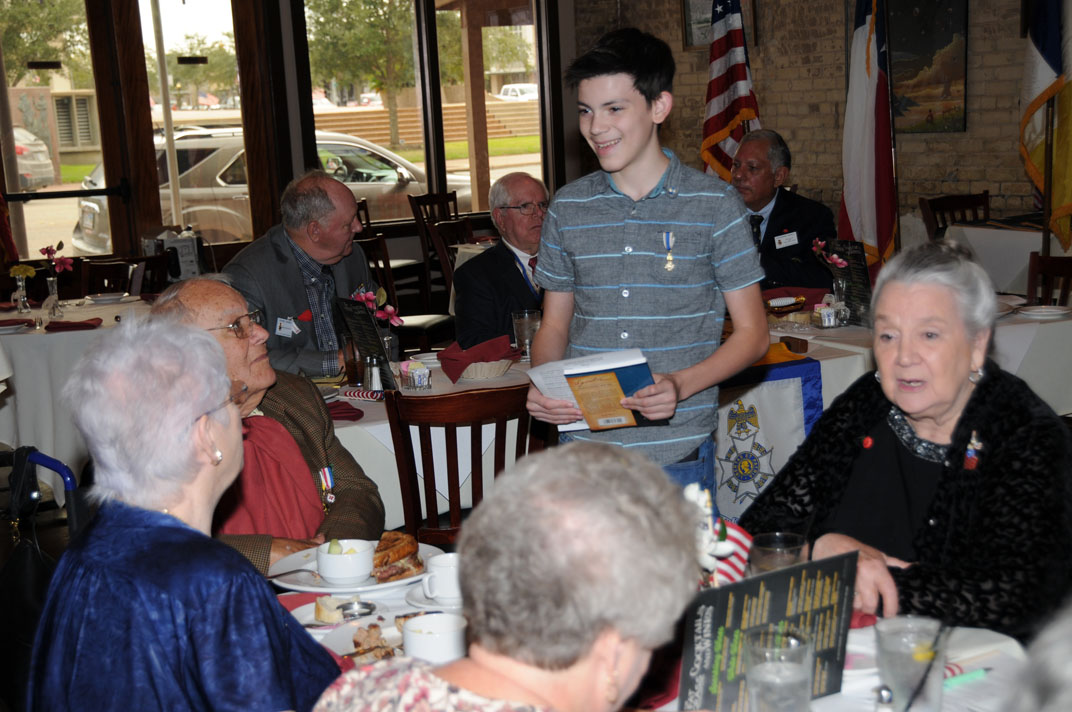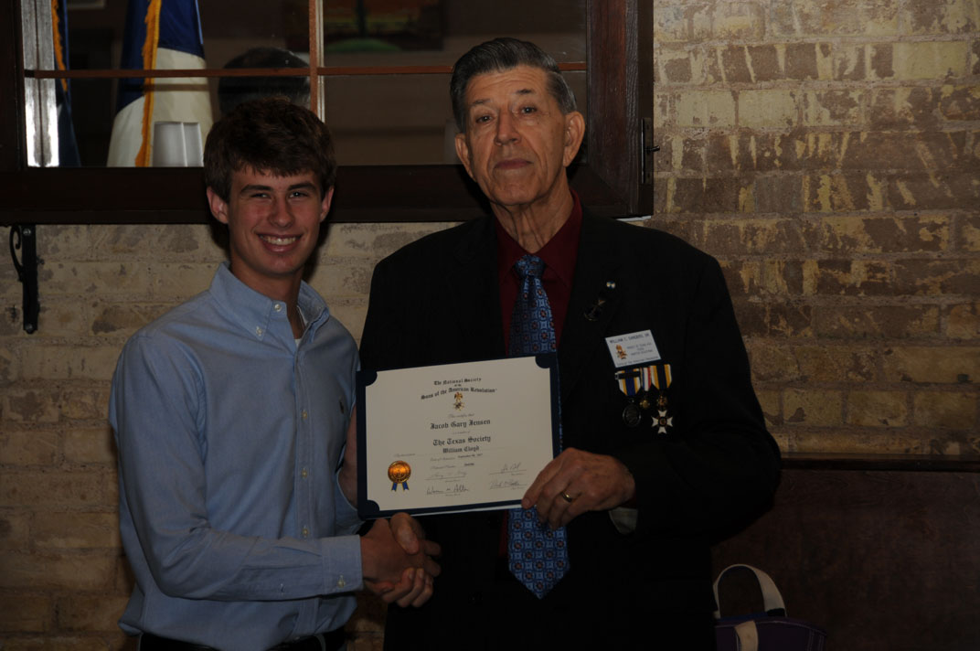 President Ray Beall presents Cadet Tyler Frankum a Certificate of Recognition for placing 2nd in the Enhanced JROTC Contest at the Texas Society, Sons of the American Revolution March 2018 meeting. 14 Apr 2018