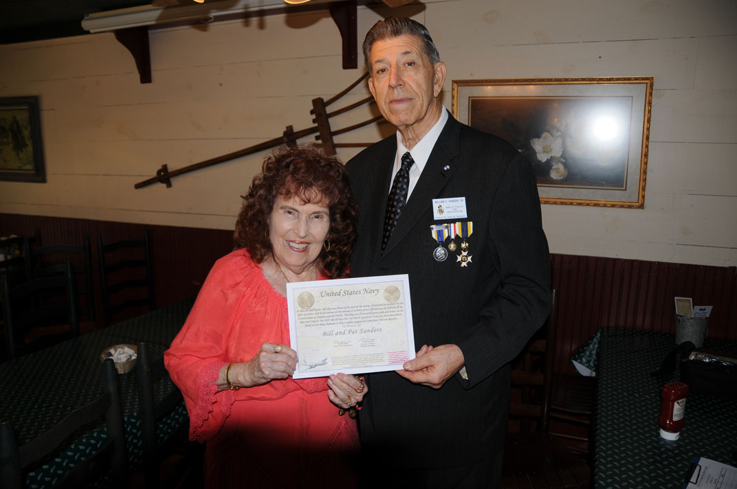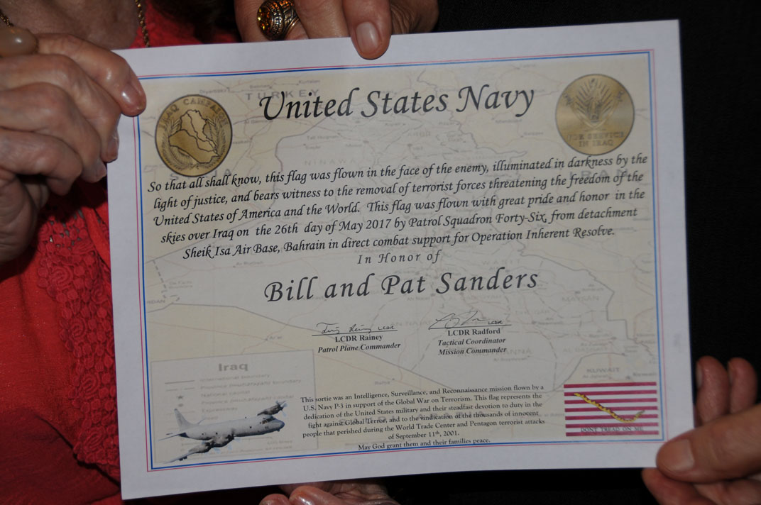 Pat and Bill Sanders were recognized by US Navy grandson with American Flag flown during combat mission and award 21 Oct 2017