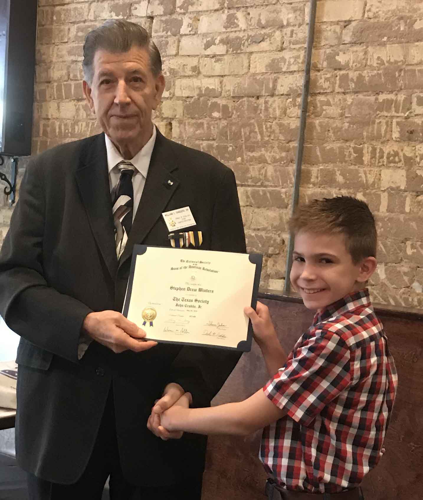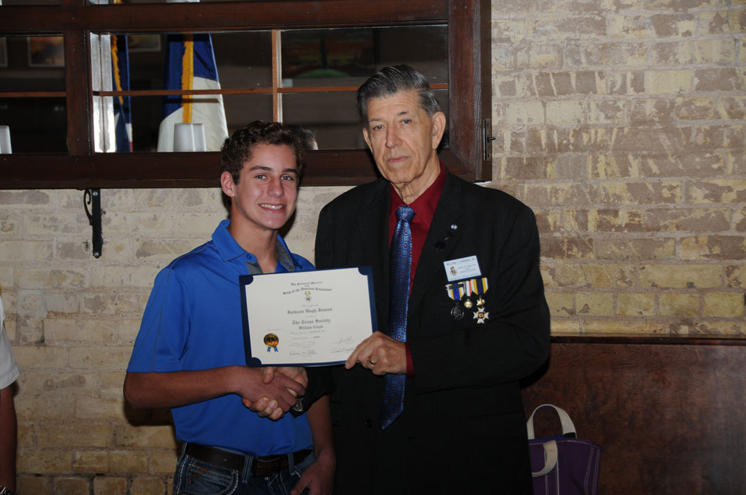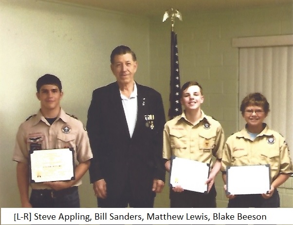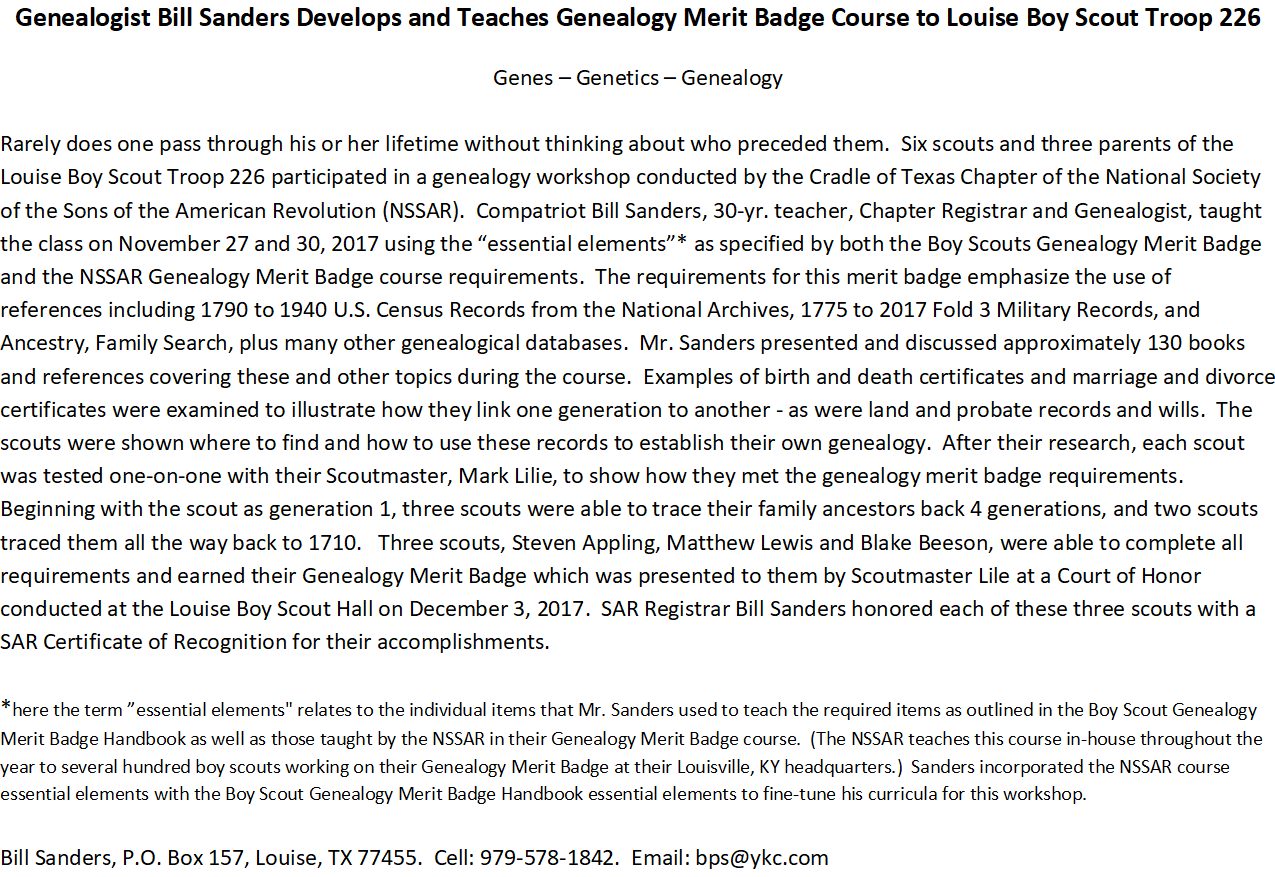 These three scouts completed all requirements for their Genealogy MB and received SAR Certificates of Recognition from Cradle of Texas Chapter Registrar/Genealogist Bill Sanders.