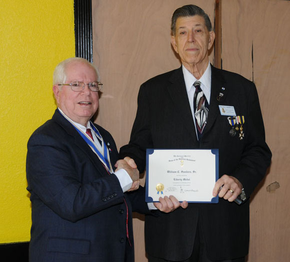 Bill Sanders (right) receives the Liberty Medal from Chapter President Win Avera for outstanding service in the recruitment of new members