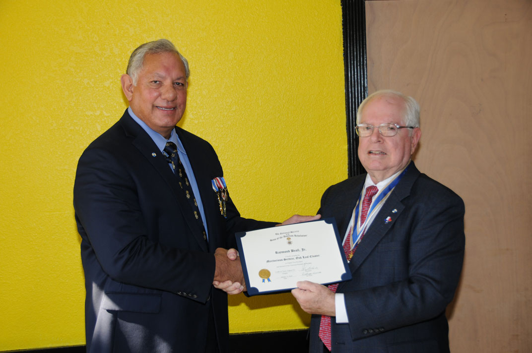 Ray Beall (left) receives the Oak Leaf Cluster from President Win Avera for Meritorious Service as Chapter Vice-President and stewardship of our American principals and heritage.