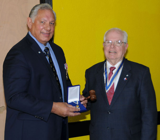 Receiving the gavel and the Dr. McAlexander Presidents Medal, Raymond Beall (left) was installed as 2018 Chapter President by outgoing President Winston Avera.