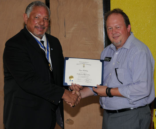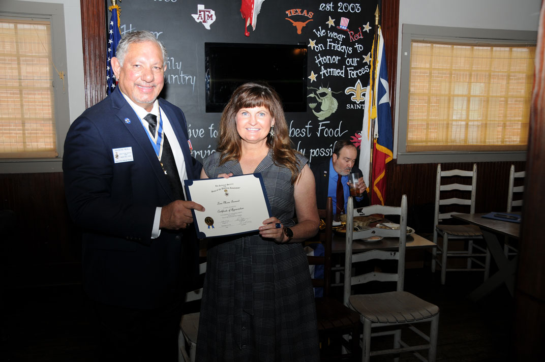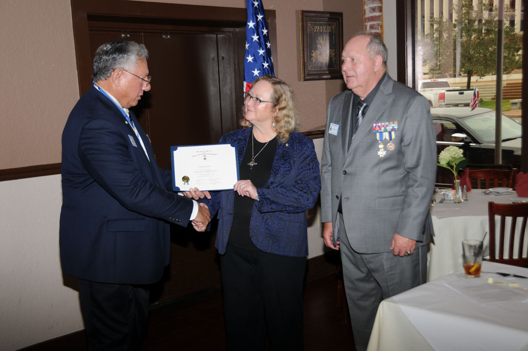 Cynthia Jordy receives a Certificate of Appreaciation from President Ray Beall and VP Rodney Weems for her speech.