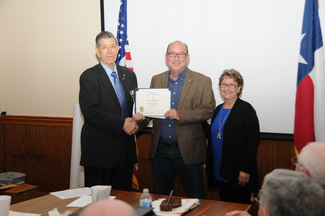 Chapter President Ray Beall presents a Chapter Appreaciation Certificate to THC speaker Bryan McAuley 13 Oct 2018 at the Los Cucos Restuarant, Wharton, TX 13 Oct 2018