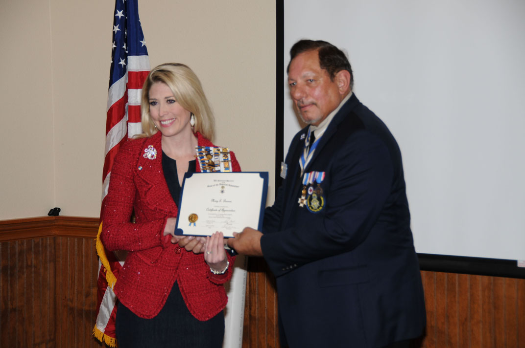 Speaker Merle Hudgins receives a Certificate of Appreciation from Vice President Ray Beall. 11 Nov 2017