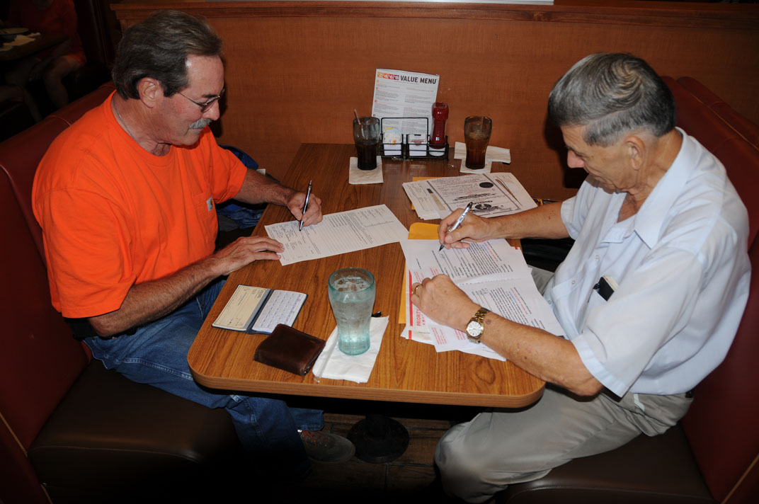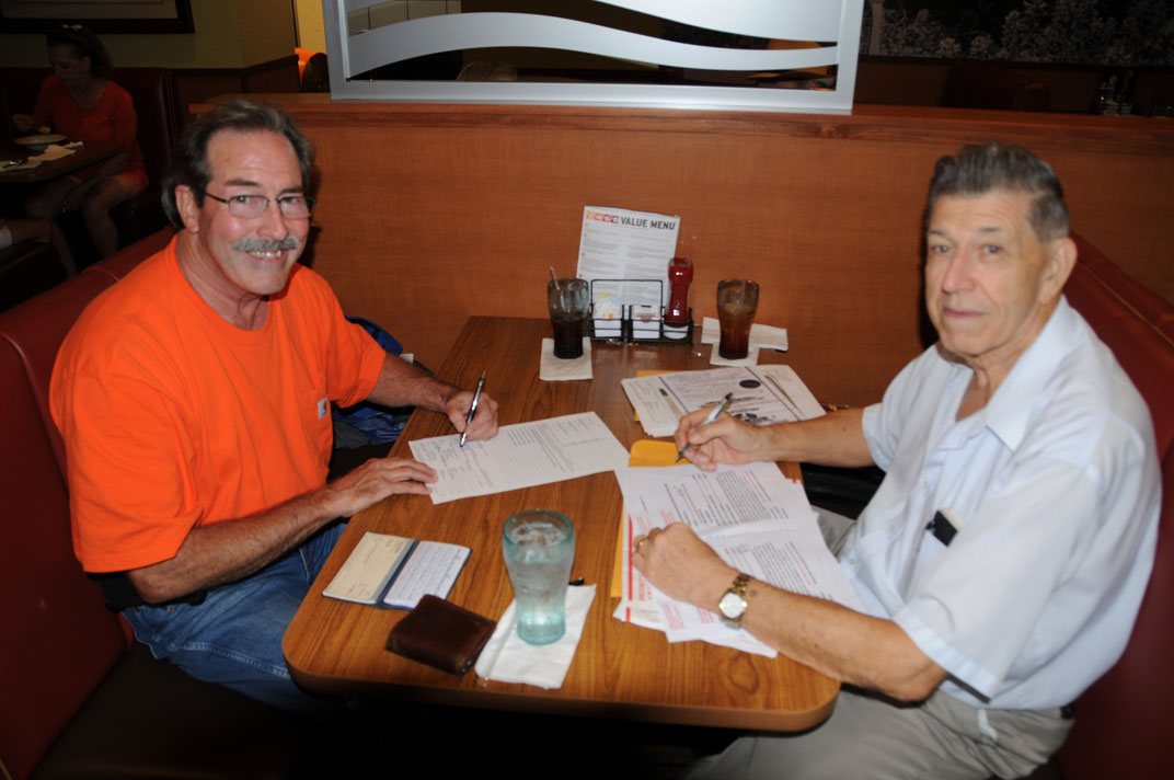 John Wiggins signing his SAR application with Registrar Bill Sanders at Denny’s in Wharton 6 Sep 2018