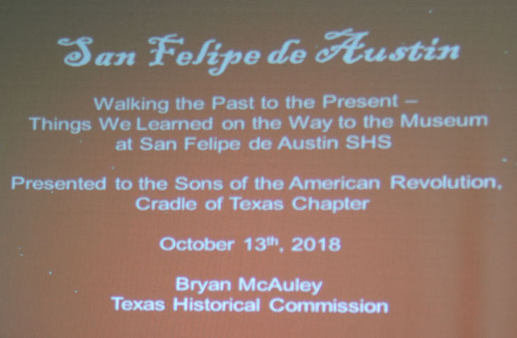 Bryan McAuley speaks to the chapter about the recently-opened San Felipe de Austin Museum 13 Oct 2018