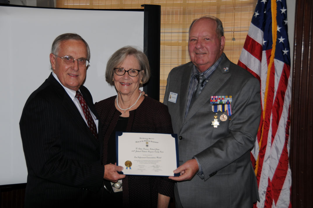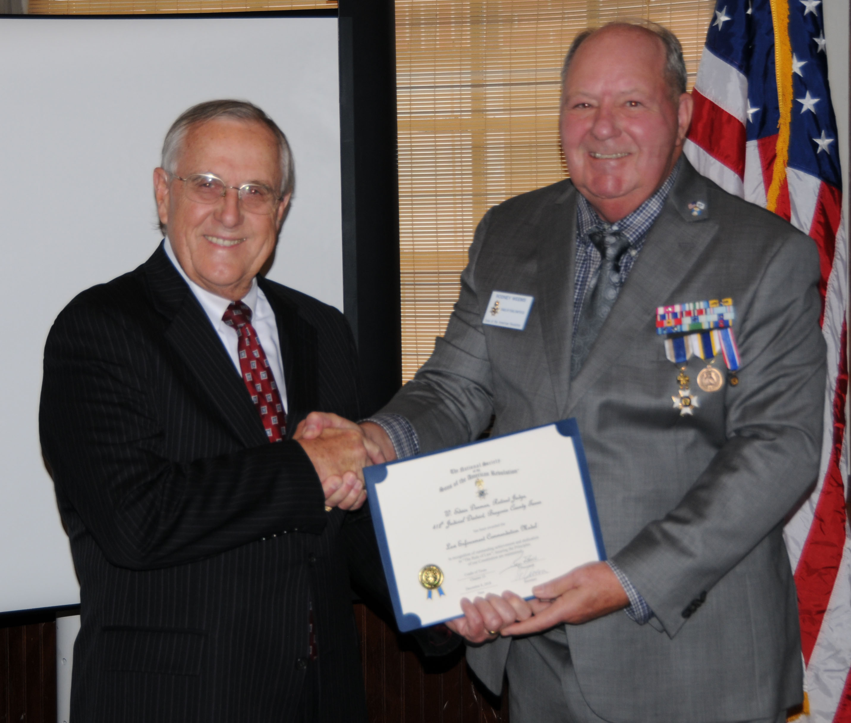 Judge Ed Denman recieves the Law Enforcement Comendation Medal from Vice President Rodney Weems, 8 Dec 2018