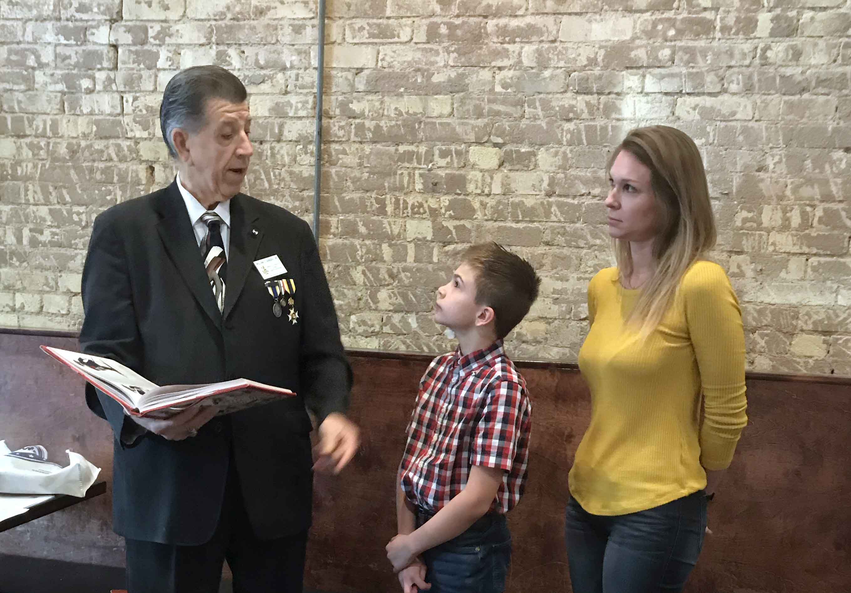 Registrar Bill Sanders shows revolutionary war uniforms to new inductee, Devon James Dull, and his mother Stacie 8 Sep 2018