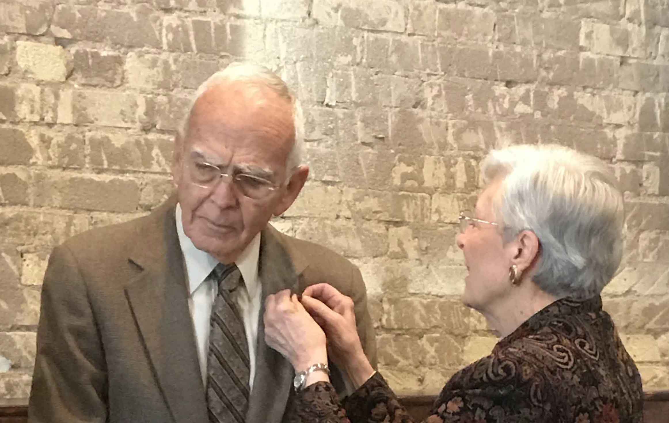 Alice Jewel Royalty pins rosette onto lapel of new member Dr. Max Leon Royalty