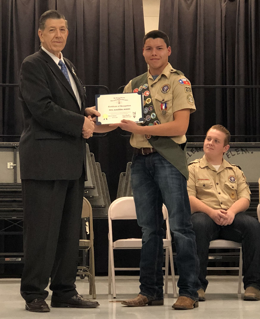 At a Louise, TX Boy Scouts of America Troop 226 Court of Honor on 18 February 2018, Pete Alexandar Moreno receives a National Society of the Sons of the American Revolution Certificate of Recognition from Cradle of Texas Chapter Registrar Bill Sanders for outstanding achievement and exceptional leadership and citizenship for attaining the rank of Eagle Scout.
