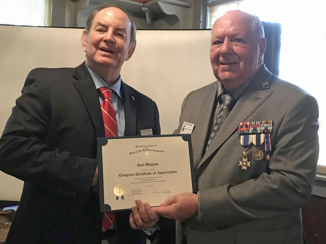 Carl Wiggins (left) receives the Chapter Distinguished Service Medal from President Win Avera for outstanding contributions of talent, time and treasure toward achieving the goals of the SAR.
