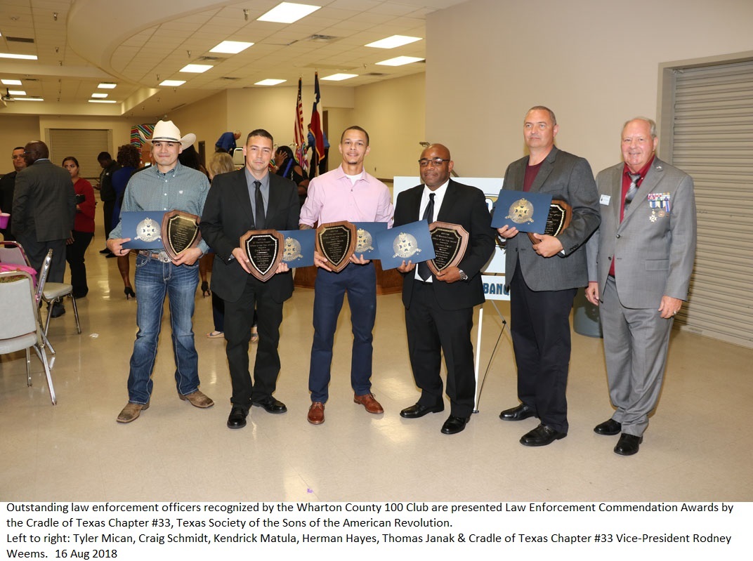 2018 Officers: (L-R) Vice President Rodney Weems, Treasurer Nelson Leopold, TXSSAR Dist. 7 VP Ron Brown, Secretary Winston Avera, Registrar/Genealogist William Sanders, President Raymond Beall and Chaplain/Historian Michael Bailey. (Not pictured, Color Guard Captain Frank Seidule.)