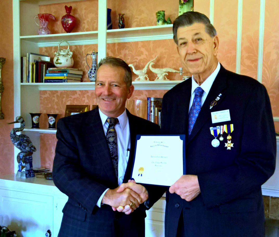 Arthur Evans (left) receives the Oak Leaf Cluster from President Win Avera for Meritorious Service as Chapter Treasurer for 7 years and steward of our American principals and heritage.